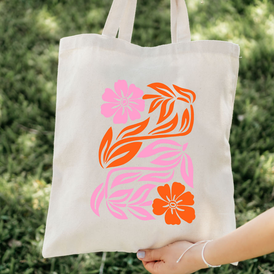Introducing our beautiful FLOWERS - TOTE BAG! This cream-colored cotton tote features a vibrant floral print, with orange and pink flowers accented by matching leaves. The stylized and lively design gives the bag a fresh and cheerful look, perfect for adding a pop of color to your outfit. Made from 100% cotton, this tote bag is not only stylish but also durable and sustainable. With dimensions of 38x42cm, it's the perfect size for carrying your everyday essentials while on the go. Add a touch of floral fun to your wardrobe with our FLOWERS - TOTE BAG!