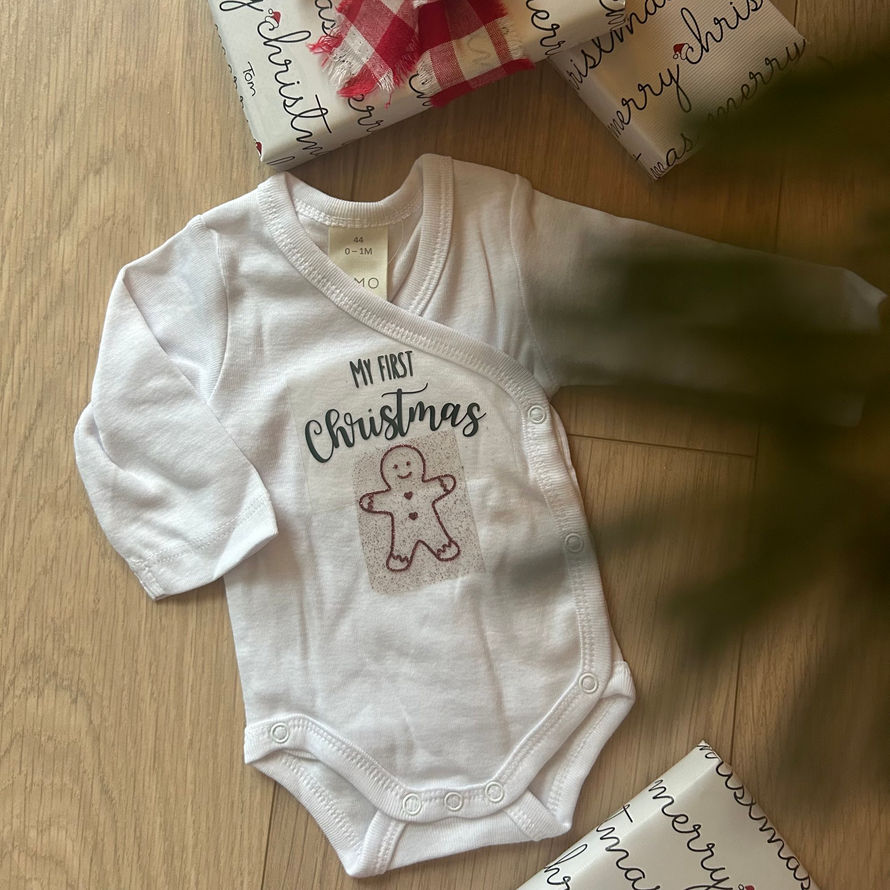Deze zachte, grijze wrap top is versierd met een glitterende gingerbread poppetje en de schattige tekst “My First Christmas”. Perfect voor kerstdagen, foto’s en cadeautjes. Ook in meerdere kleuren te verkrijgen!